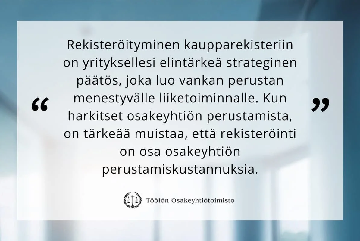 Kaupparekisteriin merkitseminen on elintärkeä askel yrityksellesi. Se antaa yrityksellesi virallisen juridisen aseman, mikä lisää uskottavuutta ja luottamusta asiakkaiden ja yhteistyökumppaneiden silmissä. Rekisteröinti tekee liiketoiminnastasi läpinäkyvämpää ja helpottaa tärkeitä prosesseja, kuten pankkitilin avaamista ja sopimusten tekemistä. Se ei ole vain lakisääteinen velvollisuus, vaan strateginen päätös, joka luo vankan perustan menestyvälle liiketoiminnalle. Kun pohdit osakeyhtiön perustamista, on tärkeää huomioida, että kaupparekisteriin merkitseminen on osa osakeyhtiön perustamisen hintaa. Vaikka rekisteröintimaksu on vain yksi osa kokonaiskustannuksista, se on välttämätön investointi yrityksen tulevaisuuteen. Osakeyhtiön perustamisen hinta sisältää rekisteröintimaksun lisäksi muita kuluja, mutta kaupparekisteriin merkitsemisen tuomat edut usein ylittävät nämä alkuvaiheen kustannukset pitkällä aikavälillä.