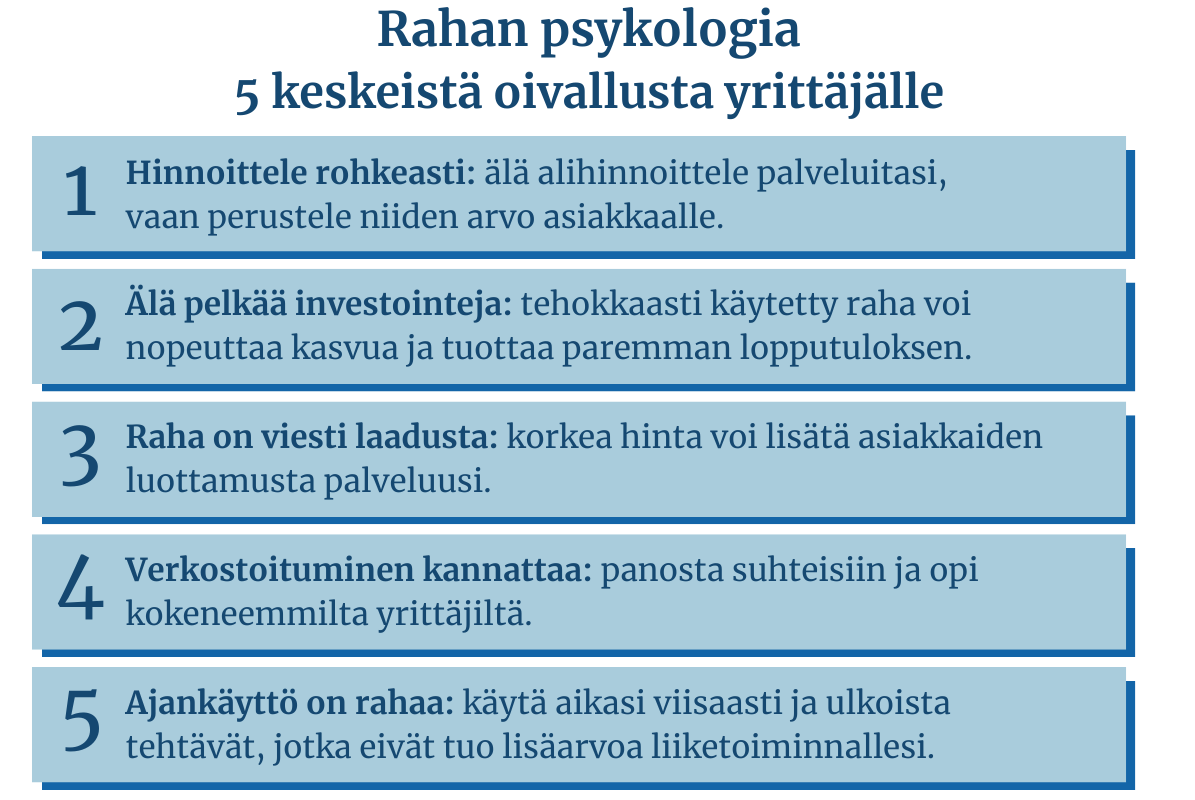 Rahataidot ja niiden psykologinen puoli ovat yrittäjyyden keskeisimpiä taitoja. Tässä tekstissä toin esiin vain muutaman esimerkin siitä, miksi on tärkeää osata ajatella rahasta ”oikein”. Oikeasti esimerkkejä olisi valtavan paljon enemmänkin.