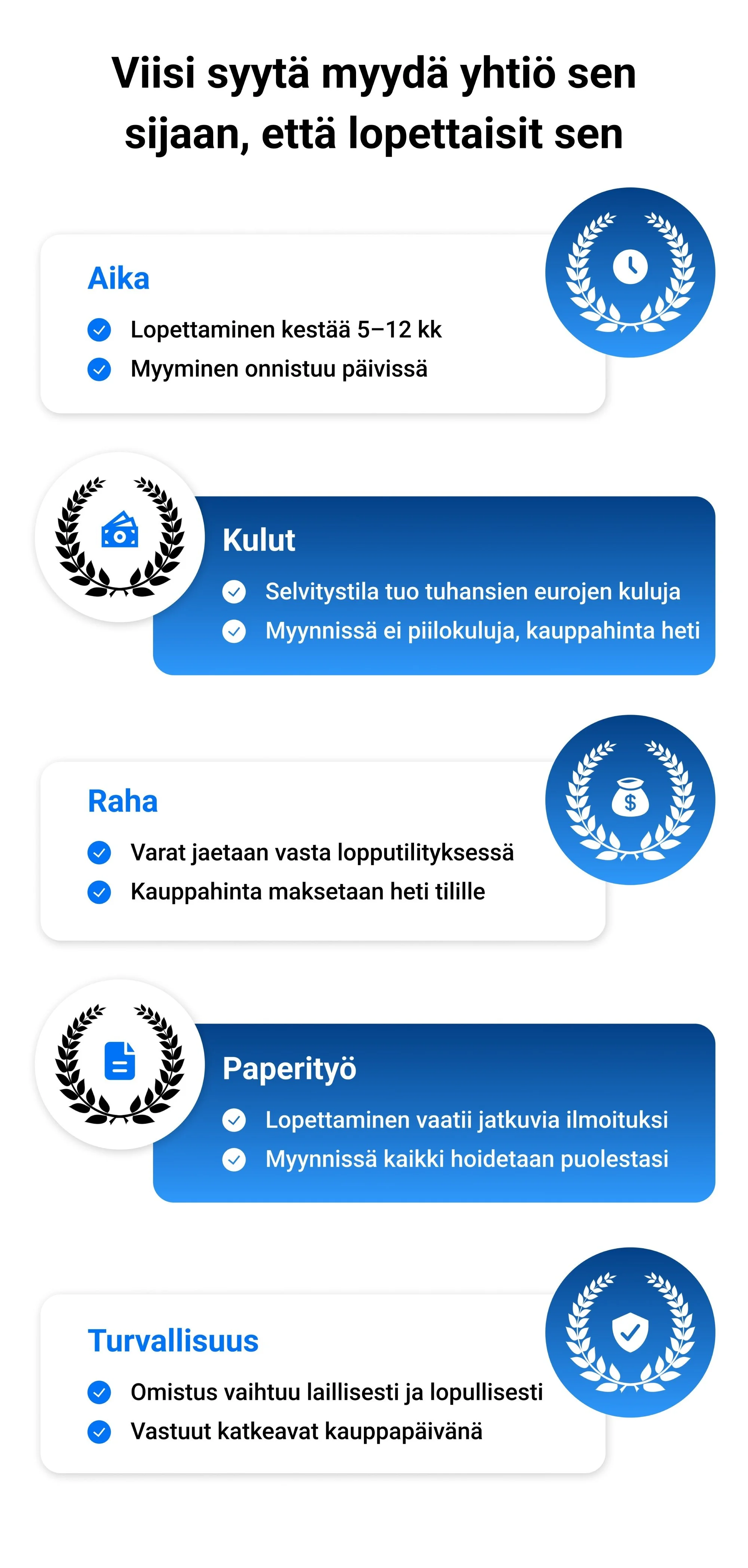Kun yrittäjän tavoitteena on vapautua yhtiöstä nopeasti ja siististi, myynti on käytännössä aina parempi vaihtoehto. Lopettaminen on perusteltua vain silloin, jos yhtiössä on velkoja, riitaisia vastuita tai rakenteita, jotka estävät omistajanvaihdoksen. Muissa tilanteissa myynti säästää kuukausien odotuksen, useiden tuhansien kulut ja jatkuvan paperisodan.