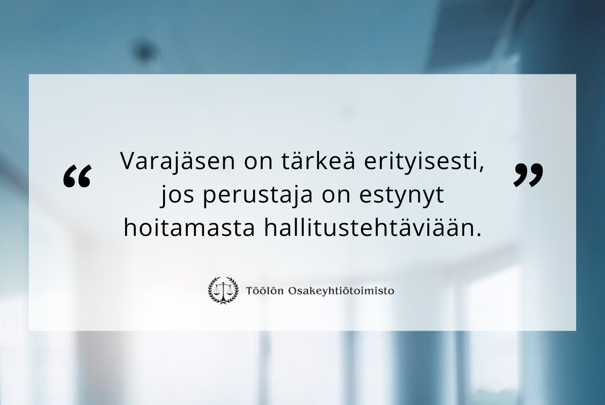 Kun hallituksessa on vain yksi varsinainen jäsen, osakeyhtiölaki edellyttää vähintään yhden varajäsenen nimeämistä. Varajäsenen tärkein tehtävä on varmistaa yrityksen toiminnan jatkuvuus tilanteissa, joissa varsinainen jäsen on estynyt hoitamasta tehtäviään. Varajäsen astuu varsinaisen jäsenen tilalle esimerkiksi tämän sairastuessa vakavasti tai ollessa muuten kykenemätön hoitamaan yhtiön asioita. Normaalioloissa varajäsenen ei tarvitse osallistua yhtiön päivittäiseen toimintaan.